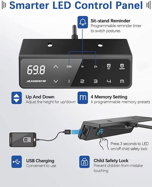 Esta alternativa a la marca Flexispot ofrece algunos detalles que pueden ser determinantes para su elección, aunque a nivel de capacidad de carga y ruido son muy parecidas. Por ejemplo el panel de MAIDeSITe es más completo, ya que se puede utilizar como cargador y además tiene un sistema de bloqueo para niños, dos complementos muy útiles para una estructura de este tipo.